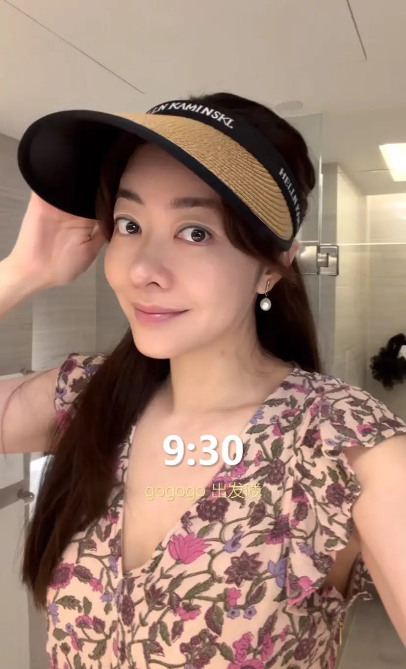 9点半的时候,熊黛林终于打扮妥当、准备出门。化着淡妆、身着碎花连衣裙,戴着珍珠耳钉、遮阳帽,度假风十足。
