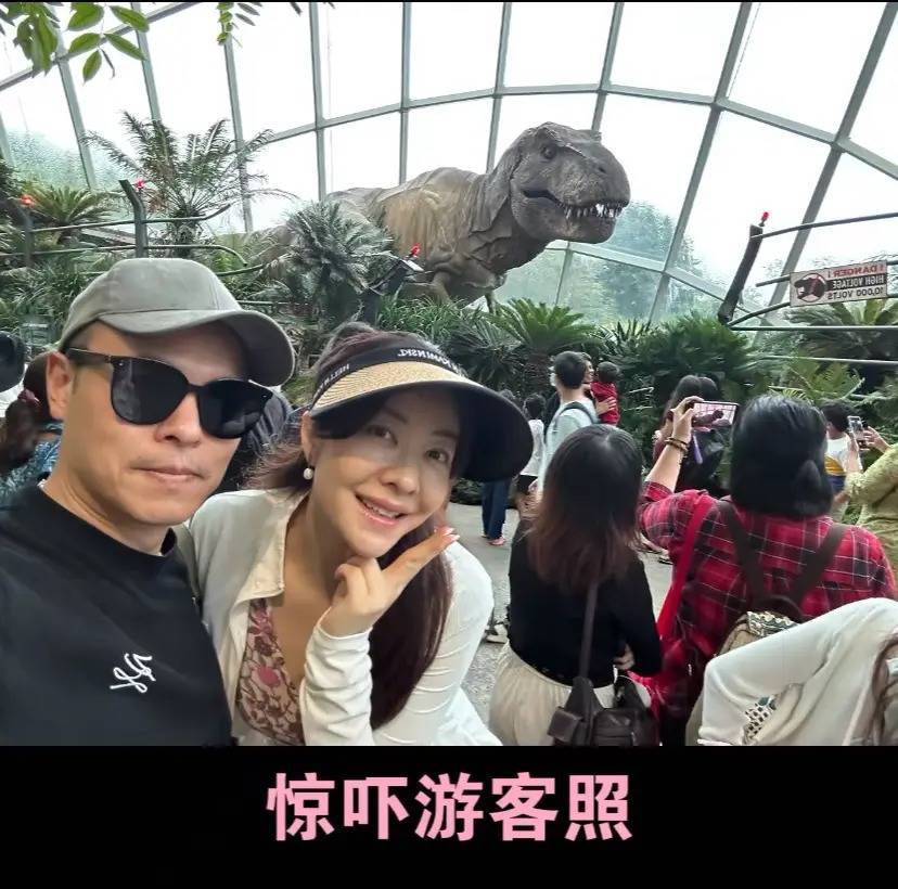 熊黛林和老公还在恐龙背景前拍了比较搞怪的游客照,夫妻俩结婚快10年了,感情一直很稳定。