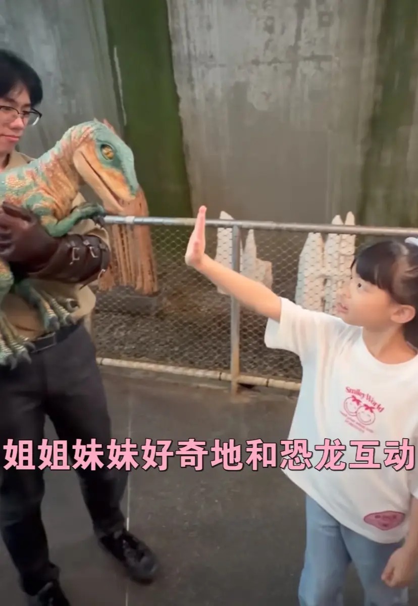 熊黛林的小女儿胆子很大,大方地与小恐龙互动,是个很调皮的女孩子。她穿着T恤牛仔裤,休闲又日常。