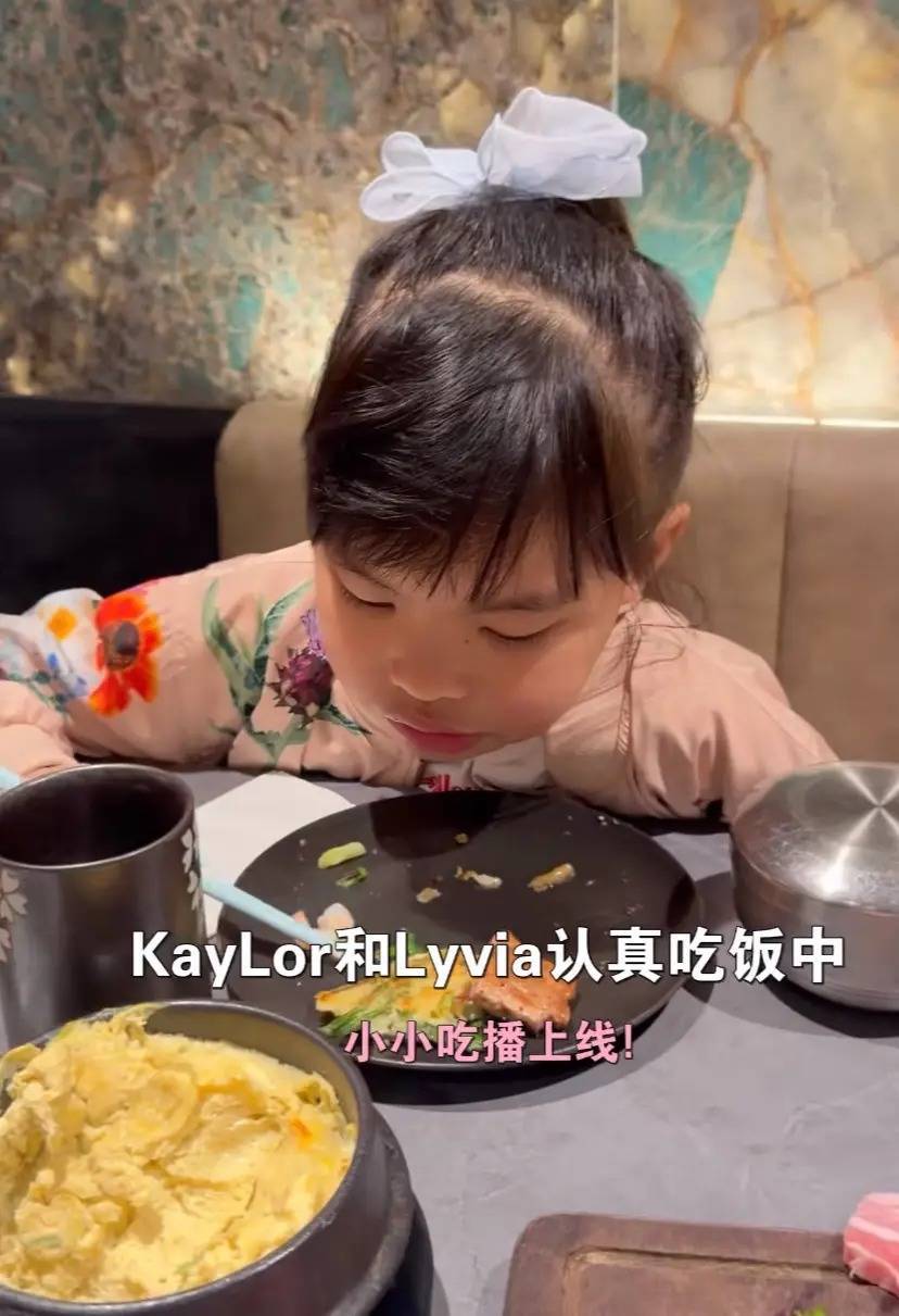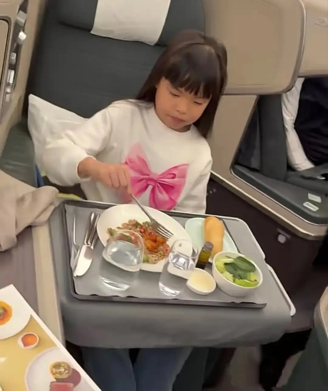 姐姐的门牙已经掉了,新牙尚未长出。她们在飞机上吃飞机餐,是一盘蔬菜沙拉,边吃边看平板,乖巧安静,不吵不闹。